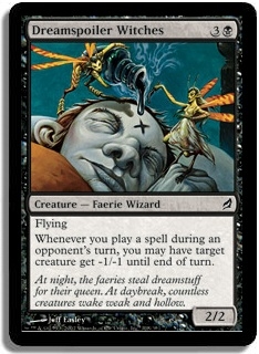 Flying Whenever you play a spell during an opponent's turn, you may have target creature get -1/-1 until end of turn.