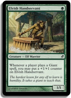 Whenever a player plays a Giant spell, you may put a +1/+1 counter on Elvish Handservant.