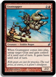 When Goatnapper comes into play, untap target Goat and gain control of it until end of turn. It gains haste until end of turn.