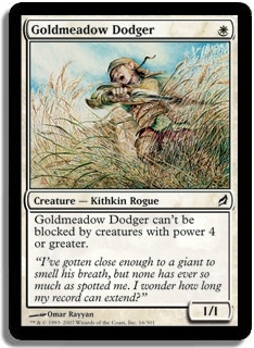 Goldmeadow Dodger can't be blocked by creatures with power 4 or greater.