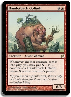Whenever another creature comes into play, you may put X +1/+1 counters on Hamletback Goliath, where X is that creature's power.