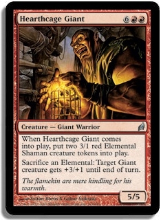 When Hearthcage Giant comes into play, put two 3/1 red Elemental Shaman creature tokens into play. Sacrifice an Elemental: Target Giant creature gets +3/+1 until end of turn.