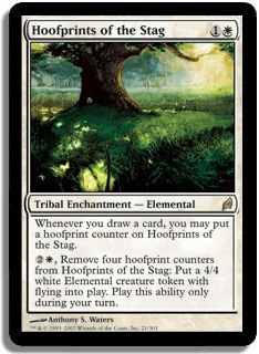 Whenever you draw a card, you may put a hoofprint counter on Hoofprints of the Stag. 2W, Remove four hoofprint counters from Hoofprints of the Stag: Put a 4/4 white Elemental creature token with flying into play. Play this ability only during your turn.