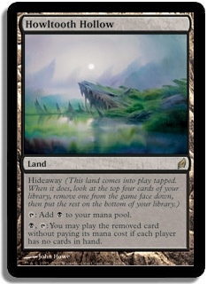 Hideaway (This land comes into play tapped. When it does, look at the top four cards of your library, remove one from the game face down, then put the rest on the bottom of your library.) T Add B to your mana pool. B, T You may play the removed card without paying its mana cost if each player has no cards in hand.