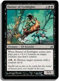 When Hunter of Eyeblights comes into play, put a +1/+1 counter on target creature you don't control. 2B, T Destroy target creature with a counter on it.
