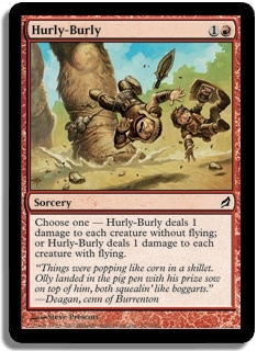 Choose one - Hurly-Burly deals 1 damage to each creature without flying; or Hurly-Burly deals 1 damage to each creature with flying.