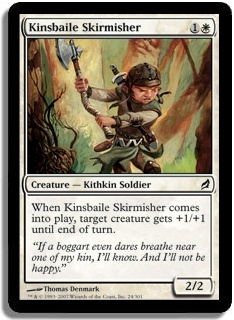 When Kinsbaile Skirmisher comes into play, target creature gets +1/+1 until end of turn.