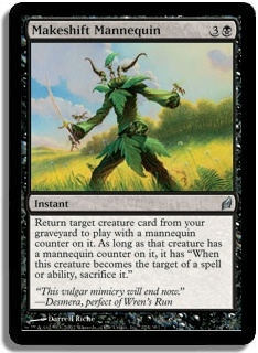 Return target creature card from your graveyard to play with a mannequin counter on it. As long as that creature has a mannequin counter on it, it has "When this creature becomes the target of a spell or ability, sacrifice it."