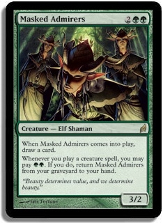 When Masked Admirers comes into play, draw a card. Whenever you play a creature spell, you may pay GG. If you do, return Masked Admirers from your graveyard to your hand.