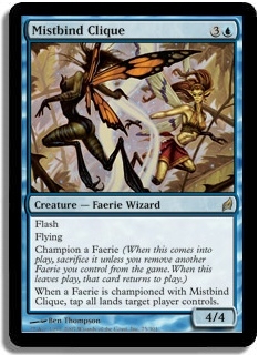 Flash Flying Champion a Faerie (When this comes into play, sacrifice it unless you remove another Faerie you control from the game. When this leaves play, that card returns to play.) When a Faerie is championed with Mistbind Clique, tap all lands target player controls.