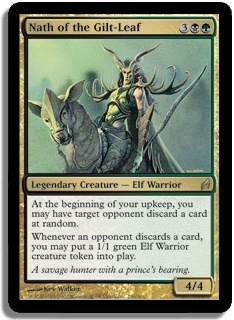 At the beginning of your upkeep, you may have target opponent discard a card at random. Whenever an opponent discards a card, you may put a 1/1 green Elf Warrior creature token into play.