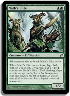 All creatures able to block Nath's Elite do so. When Nath's Elite comes into play, clash with an opponent. If you win, put a +1/+1 counter on Nath's Elite. (Each clashing player reveals the top card of his or her library, then puts that card on the top or bottom. A player wins if his or her card had a higher converted mana cost.)
