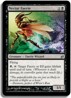 Flying B, T Target Faerie or Elf gains lifelink until end of turn. (Whenever it deals damage, its controller gains that much life.)