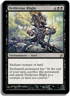 Enchant creature or land Enchanted permanent has "At the end of your turn, sacrifice this permanent and attach Nettlevine Blight to a creature or land you control."