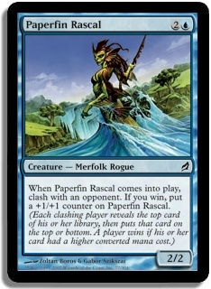 When Paperfin Rascal comes into play, clash with an opponent. If you win, put a +1/+1 counter on Paperfin Rascal. (Each clashing player reveals the top card of his or her library, then puts that card on the top or bottom. A player wins if his or her card had a higher converted mana cost.)