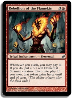Whenever you clash, you may pay 1. If you do, put a 3/1 red Elemental Shaman creature token into play. If you won, that token gains haste until end of turn. (This ability triggers after the clash ends.)