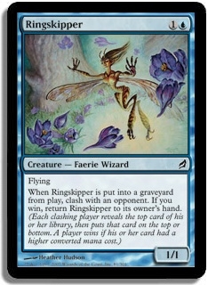 Flying When Ringskipper is put into a graveyard from play, clash with an opponent. If you win, return Ringskipper to its owner's hand. (Each clashing player reveals the top card of his or her library, then puts that card on the top or bottom. A player wins if his or her card had a higher converted mana cost.)