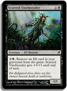 2B, Remove an Elf card in your graveyard from the game: Scarred Vinebreeder gets +3/+3 until end of turn.