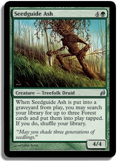 When Seedguide Ash is put into a graveyard from play, you may search your library for up to three Forest cards and put them into play tapped. If you do, shuffle your library.