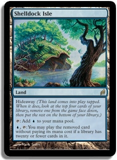 Hideaway (This land comes into play tapped. When it does, look at the top four cards of your library, remove one from the game face down, then put the rest on the bottom of your library.) T Add U to your mana pool. U, T You may play the removed card without paying its mana cost if a library has twenty or fewer cards in it.