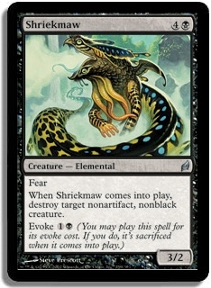 Fear When Shriekmaw comes into play, destroy target nonartifact, nonblack creature. Evoke 1B (You may play this spell for its evoke cost. If you do, it's sacrificed when it comes into play.)