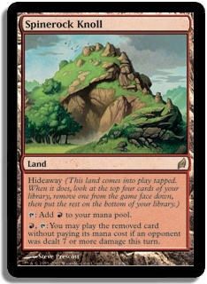 Hideaway (This land comes into play tapped. When it does, look at the top four cards of your library, remove one from the game face down, then put the rest on the bottom of your library.) T Add R to your mana pool. R, T You may play the removed card without paying its mana cost if an opponent was dealt 7 or more damage this turn.