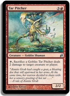 T, Sacrifice a Goblin: Tar Pitcher deals 2 damage to target creature or player.