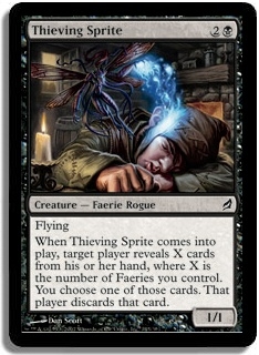 Flying When Thieving Sprite comes into play, target player reveals X cards from his or her hand, where X is the number of Faeries you control. You choose one of those cards. That player discards that card.