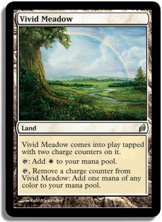 Vivid Meadow comes into play tapped with two charge counters on it. T Add W to your mana pool. T, Remove a charge counter from Vivid Meadow: Add one mana of any color to your mana pool.