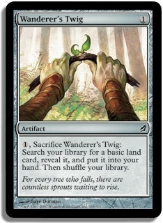 1, Sacrifice Wanderer's Twig: Search your library for a basic land card, reveal it, and put it into your hand. Then shuffle your library.