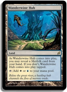As Wanderwine Hub comes into play, you may reveal a Merfolk card from your hand. If you don't, Wanderwine Hub comes into play tapped. T Add W or U to your mana pool.