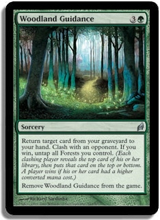 Return target card from your graveyard to your hand. Clash with an opponent. If you win, untap all Forests you control. (Each clashing player reveals the top card of his or her library, then puts that card on the top or bottom. A player wins if his or her card had a higher converted mana cost.) Remove Woodland Guidance from the game.