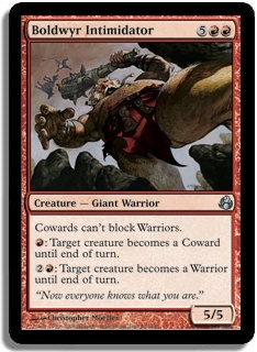 Cowards can't block Warriors. R: Target creature becomes a Coward until end of turn. 2R: Target creature becomes a Warrior until end of turn.