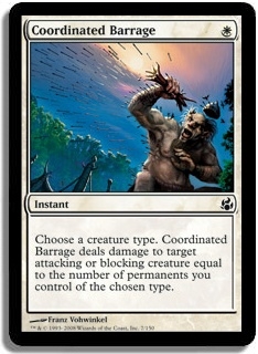 Choose a creature type. Coordinated Barrage deals damage to target attacking or blocking creature equal to the number of permanents you control of the chosen type.