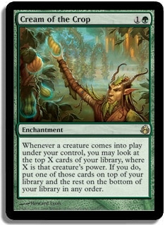 Whenever a creature comes into play under your control, you may look at the top X cards of your library, where X is that creature's power. If you do, put one of those cards on top of your library and the rest on the bottom of your library in any order.