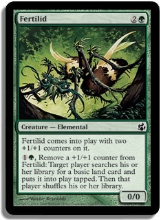 Fertilid comes into play with two +1/+1 counters on it. 1G, Remove a +1/+1 counter from Fertilid: Target player searches his or her library for a basic land card and puts it into play tapped. Then that player shuffles his or her library.