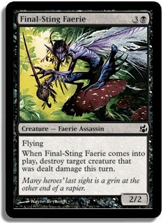 Flying When Final-Sting Faerie comes into play, destroy target creature that was dealt damage this turn.