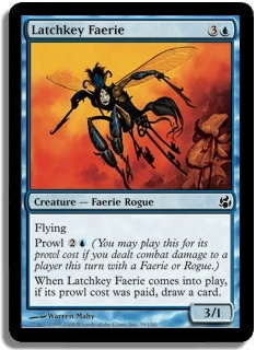 Flying Prowl 2U (You may play this for its prowl cost if you dealt combat damage to a player this turn with a Faerie or Rogue.) When Latchkey Faerie comes into play, if its prowl cost was paid, draw a card.