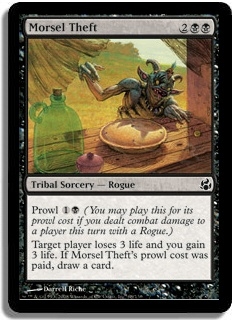 Prowl 1B (You may play this for its prowl cost if you dealt combat damage to a player this turn with a Rogue.) Target player loses 3 life and you gain 3 life. If Morsel Theft's prowl cost was paid, draw a card.