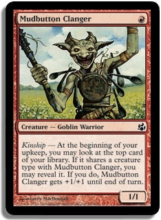 Kinship - At the beginning of your upkeep, you may look at the top card of your library. If it shares a creature type with Mudbutton Clanger, you may reveal it. If you do, Mudbutton Clanger gets +1/+1 until end of turn.