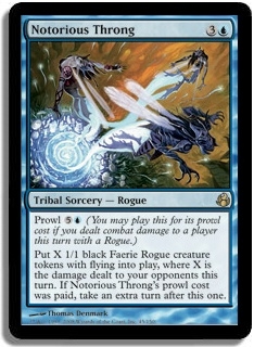 Prowl 5U (You may play this for its prowl cost if you dealt combat damage to a player this turn with a Rogue.) Put X 1/1 black Faerie Rogue creature tokens with flying into play, where X is the damage dealt to your opponents this turn. If Notorious Throng's prowl cost was paid, take an extra turn after this one.