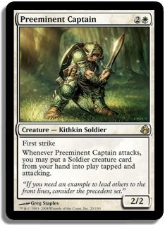 First strike Whenever Preeminent Captain attacks, you may put a Soldier creature card from your hand into play tapped and attacking.