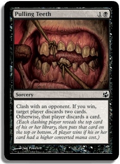 Clash with an opponent. If you win, target player discards two cards. Otherwise, that player discards a card. (Each clashing player reveals the top card of his or her library, then puts that card on the top or bottom. A player wins if his or her card had a higher converted mana cost.)