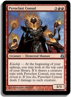 Kinship - At the beginning of your upkeep, you may look at the top card of your library. If it shares a creature type with Pyroclast Consul, you may reveal it. If you do, Pyroclast Consul deals 2 damage to each creature.