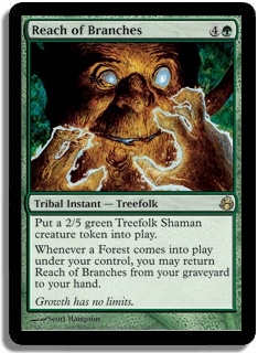 Put a 2/5 green Treefolk Shaman creature token into play. Whenever a Forest comes into play under your control, you may return Reach of Branches from your graveyard to your hand.