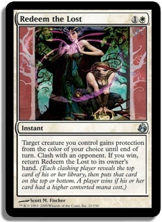 Target creature you control gains protection from the color of your choice until end of turn. Clash with an opponent. If you win, return Redeem the Lost to its owner's hand. (Each clashing player reveals the top card of his or her library, then puts that card on the top or bottom. A player wins if his or her card had a higher converted mana cost.)