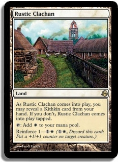 As Rustic Clachan comes into play, you may reveal a Kithkin card from your hand. If you don't, Rustic Clachan comes into play tapped. T Add W to your mana pool. Reinforce 1-1W (1W, Discard this card: Put a +1/+1 counter on target creature.)