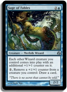 Each other Wizard creature you control comes into play with an additional +1/+1 counter on it. 2, Remove a +1/+1 counter from a creature you control: Draw a card.