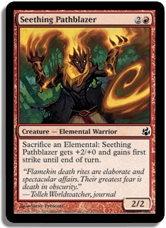 Sacrifice an Elemental: Seething Pathblazer gets +2/+0 and gains first strike until end of turn.