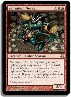 Kinship - At the beginning of your upkeep, you may look at the top card of your library. If it shares a creature type with Sensation Gorger, you may reveal it. If you do, each player discards his or her hand and draws four cards.